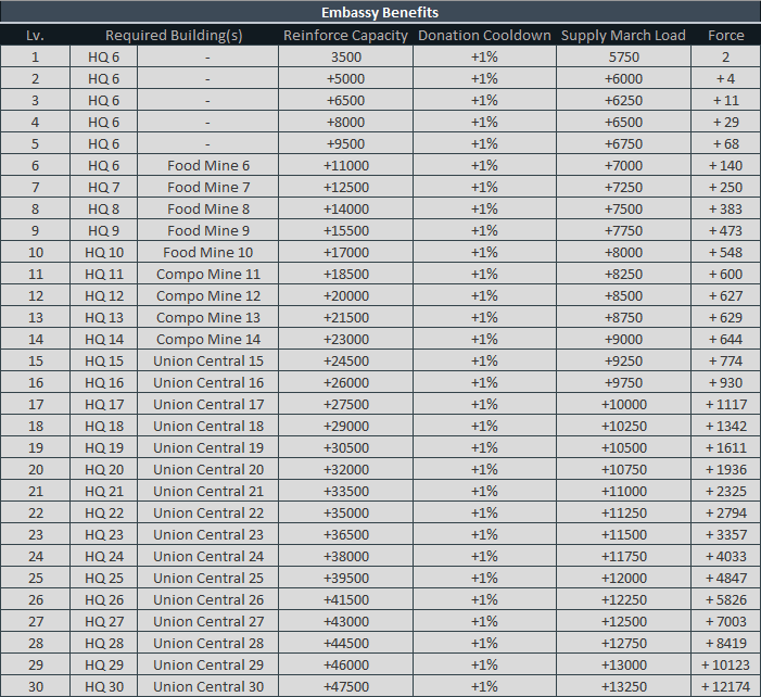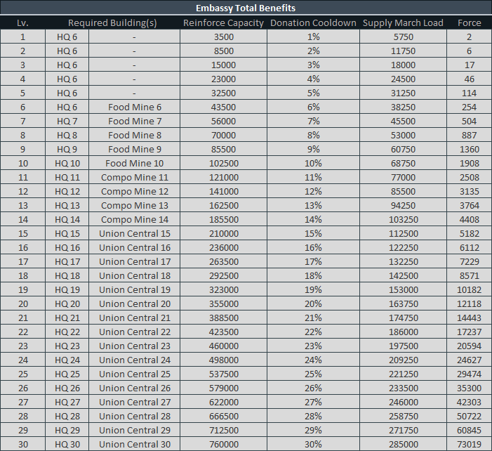 EMBASSYEmbassy BenefitsEmbassy Total BenefitsManage Reinforces, Alliance Donation Cooldown, Reinforce Capacity.